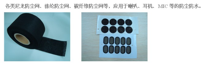 各類(lèi)尼龍防塵網(wǎng)、滌綸防塵網(wǎng)、碳纖維防塵網(wǎng)等,應(yīng)用于喇叭、耳機(jī)、MIC等的防塵防水